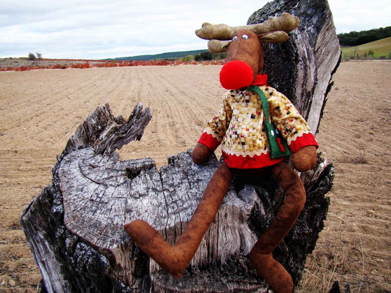 Renato es un pequeño reno, encargado de tirar del trineo de Papá Noel y que un día decidió cargarse la mochila a la espalda y viajar en solitario por el mundo sin responsabilidades. Aquí en la foto, lo podemos ver en los campos de castilla, descansando sobre un tronco, después de disfrutar de la gastronomía de la zona.