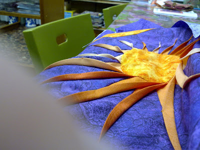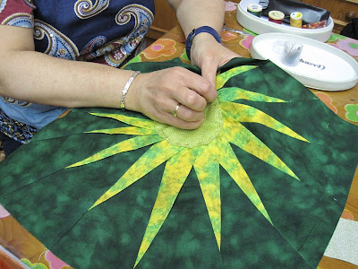 Crearemos un astro de la galaxia en tres colores. Escogeremos las telas que más nos gustan, cortaremos todas las piezas con el cúter giratorio; en total son 32 piezas con una numeración cada una de ellas, e iremos cosiendo por orden a máquina 4 cuadros de 8 piezas cada uno que luego uniremos para formar el astro, seguidamente planchamos el cuadrante y le vamos dando forma, con la plancha, a los rayos, siempre hacia un lado, preparamos el círculo del medio, lo cosemos con puntada escondida, cortamos las tiras de alrededor con uno de los colores al tono, cosemos con una puntada en el medio de cada uno de los rayos y con el mismo color para que no se vea mucho el cosido y haga el efecto de los dobleces, después pegamos la guata y la trasera y finalmente acolchamos, cada una como quiera, a mano o a máquina con el acolchado libre.